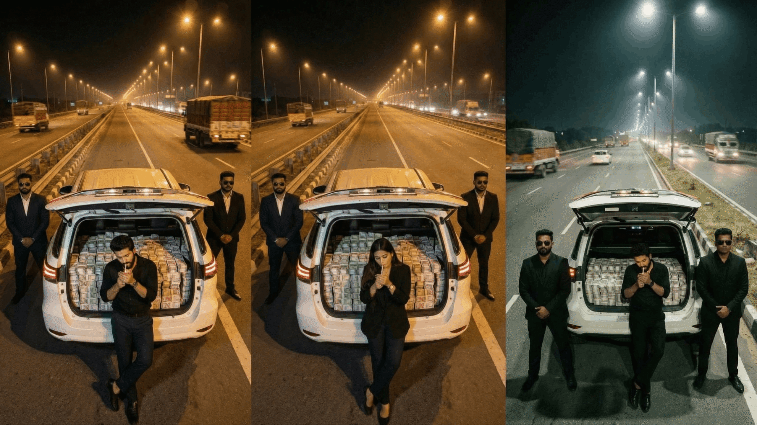 Use the uploaded image as the only visual reference.Keep the person 100% unchanged — same face, skin, beard, hair, age, body, pose, expression, clothes, posture, proportions, camera position and lighting (100% face match).Recreate the exact same composition and framing:A cinematic night scene on a wide Indian highway, shot from a high-angle top-down perspective (camera placed slightly behind and above the open car trunk, looking down toward the person and road).A white SUV is parked on the left lane shoulder.The rear trunk is fully open and tightly packed with neatly stacked bundles of Indian currency notes, filling the trunk completely from edge to edge.The person stands slightly to the right of the open trunk, leaning casually against the bumper, legs crossed at the ankle, lighting a cigarette with a match in both hands, calm and confident mood.Two professional male bodyguards in black suits and black sunglasses stand symmetrically: – one on the left of the car, – one on the right of the person, both facing forward in a protective stance.In the background: a long straight multi-lane highway with a central divider, continuous tall street lights forming a strong leading-line perspective, trucks and cars moving in both directions, light motion blur only on distant vehicles, deep night sky with light haze.Exact visual style: ultra-realistic, cinematic film still, sharp foreground, soft background bokeh, strong top street-light glow, realistic shadows under the car and people, natural skin texture, realistic reflections on the SUV paint and glass.Camera & framing: high wide-angle lens (approx 24mm), vertical frame, subject centered lower-middle, trunk filling the lower center, road vanishing point in the upper center.Color & quality: neutral cinematic color grading, slightly warm highlights, cool night shadows, high dynamic range, zero oversharpening.Output: 8K, ultra-detailed, photorealistic, no cropping, no tilt, no extra people, no extra vehicles near the foreground, no text, no logos, no watermarks, no distortion, no artifacts.